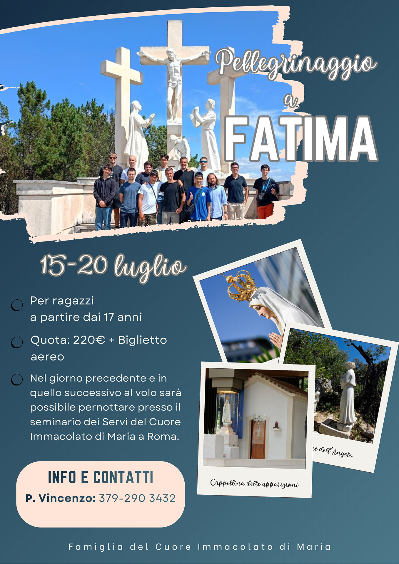 Dal 15 al 20 luglio, accolti dai padri Servi del Cuore Immacolato di Maria presenti nella nostra comunità di Fatima, a pochi passi dal santuario, sarà possibile vivere delle giornate indimenticabili alla scoperta dei luoghi e del messaggio consegnato dalla Madonna ai tre pastorelli.