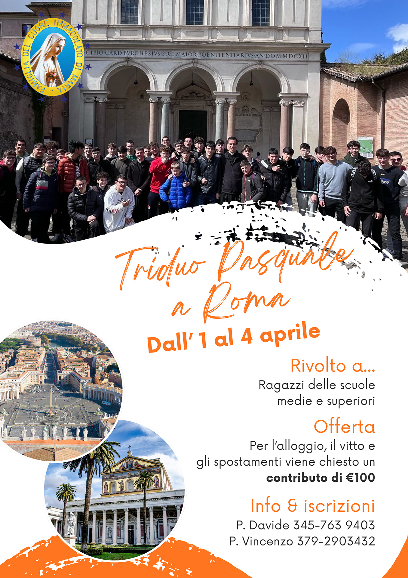 Nei giorni dall'1 al 4 aprile si svolgerà a Roma il consueto appuntamento del triduo pasquale per i ragazzi delle superiori e delle medie presso il seminario dei Servi del Cuore Immacolato di Maria a Roma.